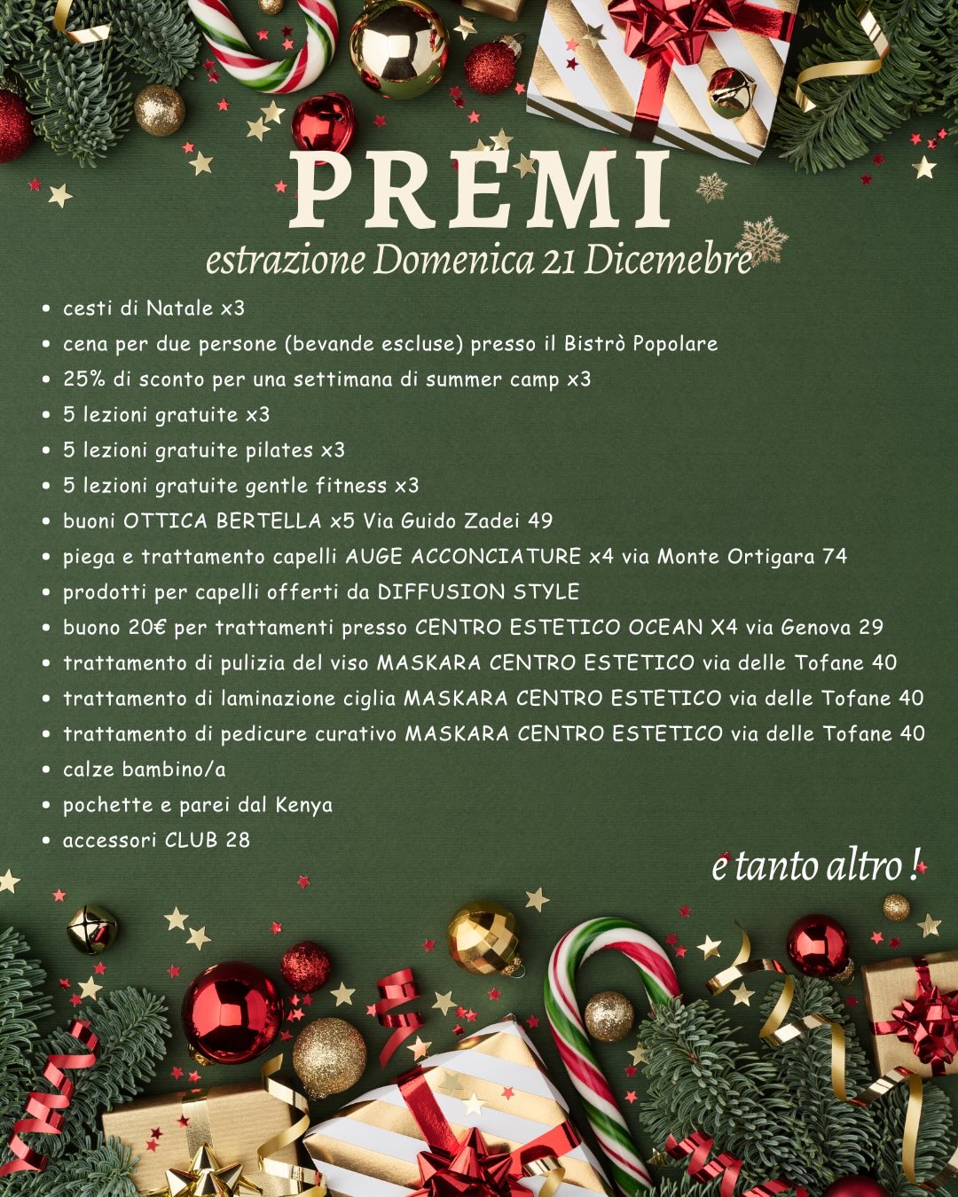 L’estrazione dei premi avverrà durante il saggio di Natale, vi alleghiamo la locandina con alcuni dei fantastici premi che potrete vincere! 🎁